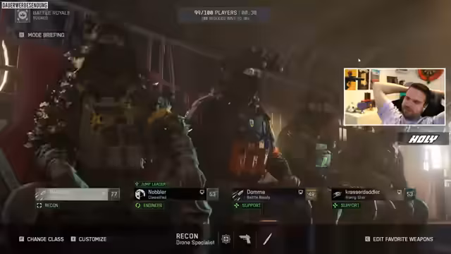 04:29:44Die Spieler sammeln fleißig Loot und Upgrades, wobei ein Spieler sich über ein „unfassbarstes Loot“ freut, das jedoch nur eine Hauptwaffe enthält. Sie versuchen, Missionen zu erfüllen und weitere Weapon Drops zu sichern, wobei sie sich über die Menge an gesammelten Gegenständen amüsieren. Die Gruppe gerät in weitere Gefechte, wird jedoch oft von hinten oder von unerwarteten Positionen angegriffen, was zu schnellen Niederlagen führt. Die Frustration über die verlorenen Boosterzeiten und die Schwierigkeit, im Spiel Fuß zu fassen, wächst, während sie über einen Moduswechsel nachdenken.