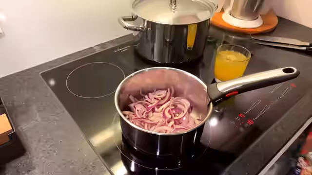 Herstellung der Balsamico-Zwiebelsauce und Süßkartoffelpüree