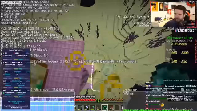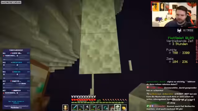 00:31:28Der Streamer ist im Minecraft-Projekt auf Platz 10, was unerwartet gut ist. Allerdings stirbt sein Teammitglied, wodurch die Punktausbeute halbiert wird. Das schafft enormen Zeitdruck. Es müssen nun in verbleibenden zweieinhalb Stunden so viele Punkte wie möglich gesammelt werden, um den Vorsprung zu halten und auf die Plätze vorne zu kommen.