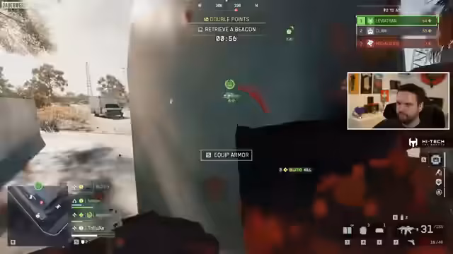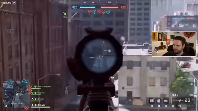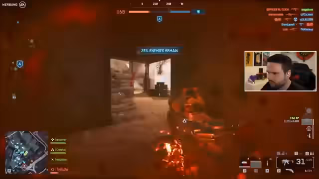 03:51:50Der Streamer befindet sich auf einem Dach und kommentiert die Intensität des Geschehens auf Punkt B, wo er schnell wieder stirbt. Er erwähnt, dass er seine Beacon zerstört hat und die Gegner wahrscheinlich heruntergesprungen sind. Er überlegt, welche Aufgaben er erfüllen kann, da das Suppressen von Gegnern mit LMGs nicht mehr möglich ist und er stattdessen Granatenschaden verursachen muss, was er als Assault-Spieler versucht. Er äußert Frustration über die Schwierigkeit einer Challenge, die 100 Kills mit Assault Rifles auf 50 Metern Entfernung erfordert, da dies eine Distanz ist, die normalerweise Sniper-Waffen vorbehalten ist. Er hofft auf zukünftige Ranked-Modi oder Streamer-Turniere, bei denen der Verlust einer Runde Konsequenzen hätte, um Spieler zu motivieren, mehr auf Objectives zu spielen. Aktuell sei der Fortschritt bei Conquest-Runden nur auf XP-Gewinn beschränkt, ohne wirklichen Verlust bei einer Niederlage.