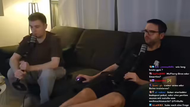 00:37:41Der Streamer erwähnt ein Problem mit seiner Maus, das sich 'komisch' anfühlt und witzelt, er habe 'keine Legs mehr'. Für das Essen wird ein Plan geschweigt: McFlurry, Red Thai Chicken Curry, Proteinpasta Bolognese oder Hähnchen Fajita Bowl. Bestellungen werden als zu teuer (75€ für zwei Gerichte) abgelehnt. Persönliche Anekdote: Kevin und Leonard wohnten in Nordrhein-Westfalen in einem Kilometer Abstand, ohne sich zu kennen, bis auf einen 'hässlichen' Typen, was zu einer humorvollen Erinnerung führt.
