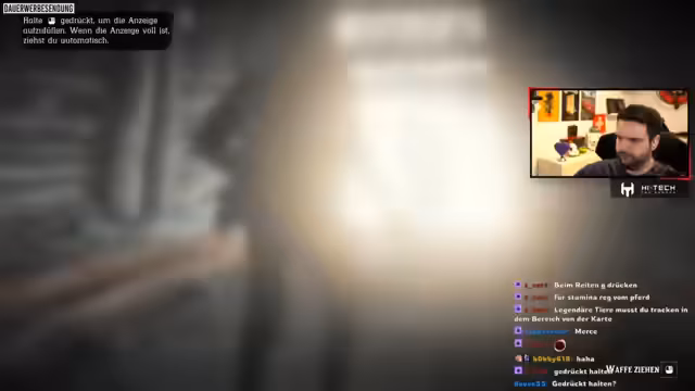 01:59:33Ein intensiver und hektischer Abschnitt beginnt mit der Verfolgung eines feindlichen Reiters. Nach einem turbulenten Kampf, bei dem sowohl der Gegner als auch sein Pferd ausgeschaltet werden, folgt eine chaotische Flucht, bei der der Streamer versehentlich eine Mord-Flagge auslöst und nun selbst kopfgeldgesucht ist. Parallel dazu versucht er, legendäre Tiere zu jagen und findet dabei ein seltenes Jagdmesser in einer Mine, was ihn in eine gefährliche Situation bringt, als Gesetzhüter die Verfolgung aufnehmen. Diese Kombination aus Jagd, Flucht und ungewolltem kriminellem Handeln sorgt für actionreiche Momente und ständige Nervosität bei der Bewegung durch die Gegend.