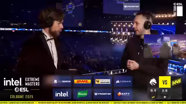 00:15:01Mit dem offiziellen Start des Matches beginnt das Kommentatoren-Duo. Der Streamer beschreibt den einzigartigen Live-Vibe und die Energie im Publikum. Es fällt auf, dass sehr viele Vitality-Fans anwesend sind, was die besondere Atmosphäre der LANXESS Arena unterstreicht. Das Kommentatorenteam aus Michele und Knochen für das zweite Match wird vorgestellt. Armin fungiert als Außenreporter und filmt den Walk-In der Teams. Der Streamer äußert Bewunderung für die professionelle Produktion und die immense Aufmerksamkeit, die das Event in der Streaming-Community genießt.