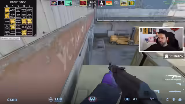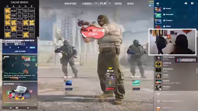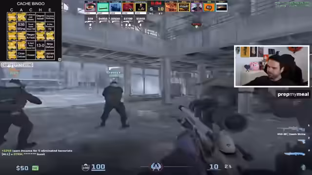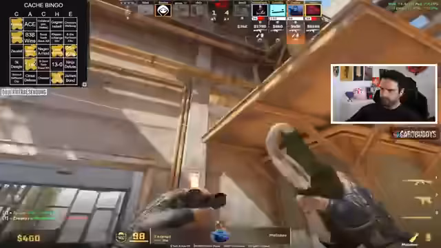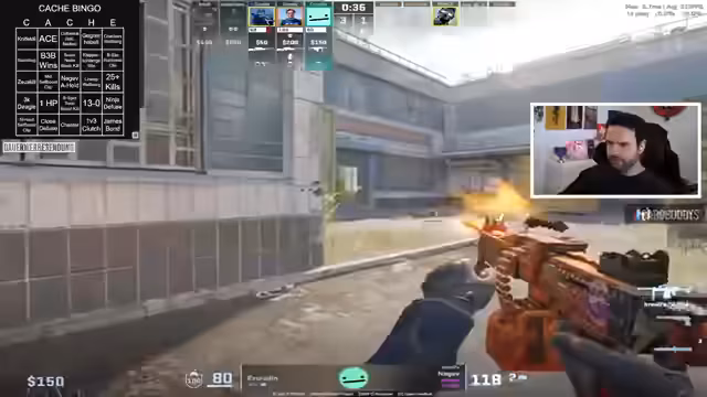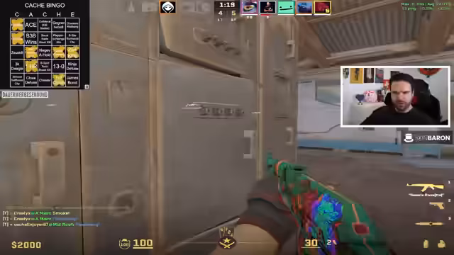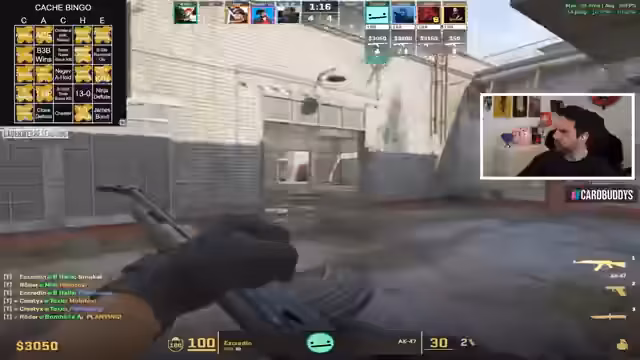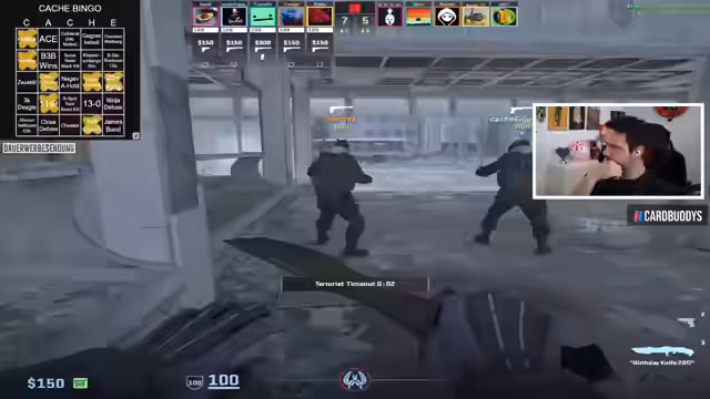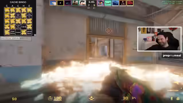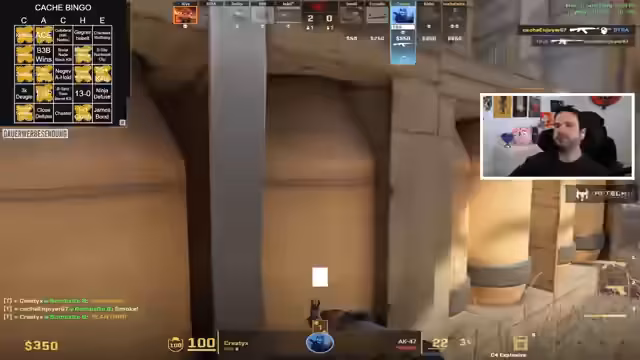 00:58:37Das Team beginnt mit ersten Spielrunden auf Cache. Es gibt einige Bingo-Versuche und bereits erste Erfolge. Der Streamer erwähnt ein erfolgreiches Bingo-Feld und zeigt fortlaufend den Fortschritt. Die Runden sind teilweise spannungsgeladen, mit knappen Siegen und Niederlagen. Ein besonders bemerkenswertes Play ist ein Zeus-Kill durch eine Wand, was als Bug diskutiert wird. Zuschauer werden aktiv eingebunden, um Bingo-Felder zu identifizieren.