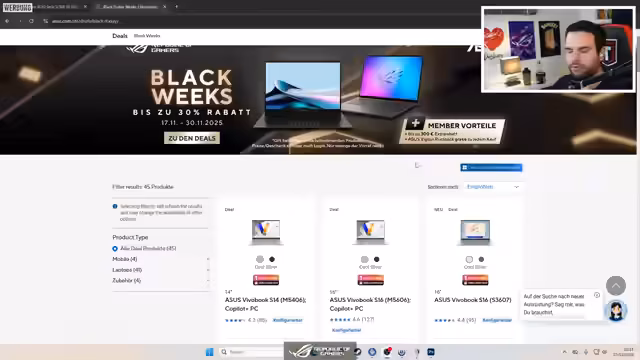 08:07:23Im Stream wird die Organisation der jährlichen WeihnachtsLAN vom 15. bis 22. Dezember in Weibling angekündigt. Als großer Partner für dieses Event wird Asus benannt, das zahlreiche Preise für die Teilnehmer stellen wird, darunter Headsets, Mäuse, Tastaturen, Mauspads, Merchandise und ein Hauptpreis in Form eines 610-Hertz-Monitors. Im Zuge der Partnerschaft kündigt der Streamer zudem ein Black Friday Sale bei Asus an, der noch bis zum 30. November läuft und erhebliche Rabatte auf verschiedene Notebook-Modelle verspricht.