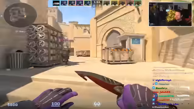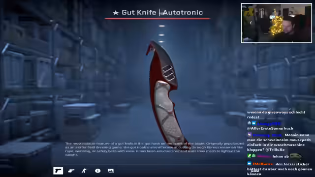 04:51:49Es findet eine Verlosung eines Gutknife Autotronic im Wert von 105 Euro statt. Teilnehmer müssen ihren Trade-Offer-Link bereithalten. Bei Erreichen von 500 Zuschauern wird der Gewinner ermittelt. Ferox2 gewinnt das Messer und erhält zusätzliche Bonus-Skins und Sticker für seine schnelle Reaktion. Der Trade wird live bestätigt und das Messer verschwindet aus dem Inventar.