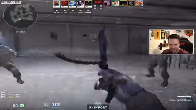 00:10:23Nach den technischen Diskussionen beginnt das erste Match auf der ausgewählten Map. Das Team trifft strategische Entscheidungen über den Startpunkt, wobei eine Taktik mit 4 B angewandt wird. Es kommt zu einem frühen Feuergefecht, bei dem der Streamer durch eine aggressive Aktion, das Verhindern eines Headshots, auffällt und das Momentum des Spiels an sich zieht.