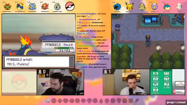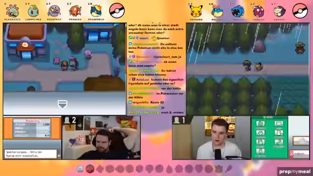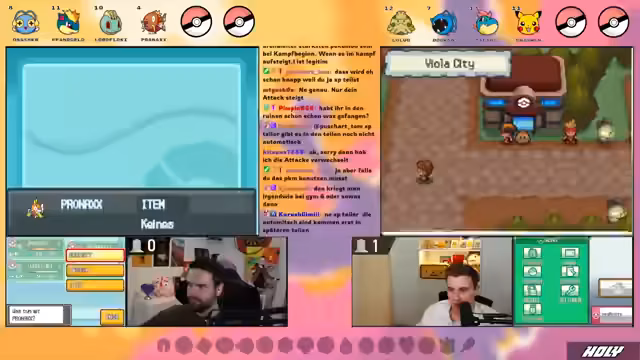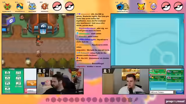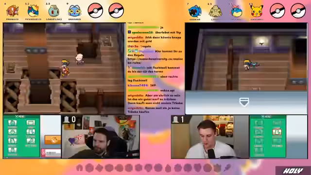 00:13:44Beide Streamer testen ihre Controller und die Sound-Einstellungen. Es gibt kleine technische Probleme, wie etwa den fehlenden Spielsound bei einem der Streamer. Die Nuzlocke-Regeln werden detailliert erklärt: Es dürfen immer nur das erste Pokémon auf jeder Route gefangen werden, und nur benutzt werden, wenn beide Partner fangen. Zusätzlich ist ein Randomizer aktiv, der Starter, Wildpokémon und Trainer-Pokémon komplett zufällig macht, was zu unvorhersehbaren und gefährlichen Situationen führen kann. Heal-Items im Kampf sind erlaubt, da sie beide nicht mit PP-Sparen arbeiten wollen.