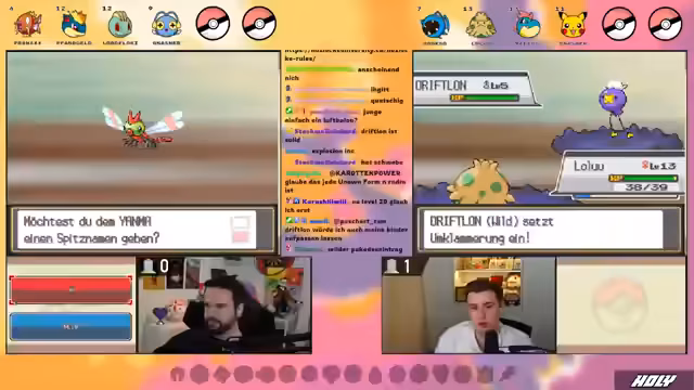00:19:57Nach dem Neustart der Session und dem Laden der neuen, randomisierten ROM erhalten beide Streamer ihre neuen Starter. Die Pokémon werden nach Subscriben benannt. Der erste Starter von @segal ist ein Nosepass, während der Streamer selbst den Starter Vylord erhält. Beide Pokémon erhalten ihre Wesen (Naturen) und die Starts laufen nun auf Englisch. Die Soul Link ist aktiv, was bedeutet, dass das Schicksal beider Teams untrennbar miteinander verbunden ist. Die erste Begegnung auf Route 29 ist ein Hitran, ein legendäres Pokémon, das das erste Pokémon sein soll. Da es sich als fast unmangbar erweist, wird es nicht gefangen, was den Anfang des Runs als glücklich bezeichnen lässt.