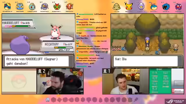 01:40:00Bei einem Kampf gegen einen Trainer auf Route 30 erleidet das Team schwere Verluste. Das Starter-Pikachu wird nach mehreren kritischen Treffern besiegt. Kurz darauf stirbt auch Knilz. Das einzige überlebende Pokémon, Kunascha, ist verwirrt und verletzt. Um ein neues Teammitglied zu erhalten, wird auf Route 46 ein Pinplup gefangen, der auf Deutsch 'Kliplup' heißt. Es wird im Chat die Verwirrungsregel von Generation 3 besprochen: Verwirrte Pokémon können sich durch eine Attacke selbst verletzen. Der Streamer bleibt optimistisch und plant, das Team mit einem Zubat auf Route 30 zu erweitern.