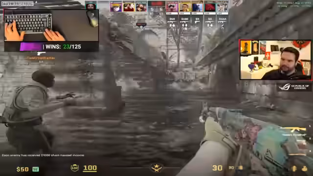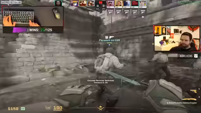 00:32:43Nach den Serverproblemen können sie endlich Counter-Strike spielen. Es gibt intensive Runden mit verschiedenen Taktiken, Positionierungen und Waffeneinsätzen. Der Streamer analysiert das Spielgeschehen, kommentiert die Gegnerstrategien und sucht nach Fehlern in der eigenen Teamperformance.