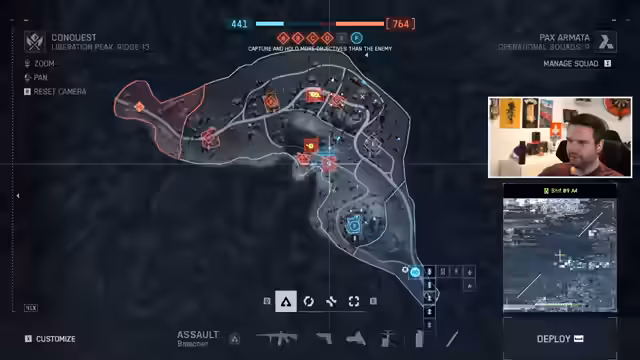 00:18:03Nach erfolgreicher PC-Reparatur startet die Battlefield 6-Session mit Kameraden. Im Spiel wird der Conquest-Modus auf der Map 'Operation Firestorm' gespielt. Der Streamer erkundet zunächst die Klassen und deren Fähigkeiten, speziell den Assault mit seiner manuell zündbaren Ulti, die einen Adrenalin-Boost für Squadmates in der Nähe verleiht. Das Score-System zur Aktivierung dieser Fähigkeiten wird dabei als undurchschaubar und frustrierend empfunden.