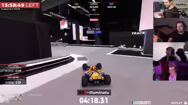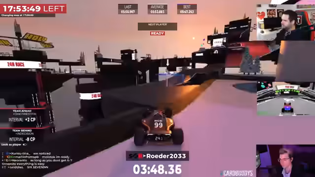01:59:47Die Sprecher reflektierten über die aktuelle Situation im 24-Stunden-Trackmania-Rennen und berichteten, dass sie seit Stunde 20 fahren. Es wurde bemängelt, dass zu wenig mit Controllern gespielt wurde und das Fahrgefühl im Cam-2-Modus ungewohnt ist. Dabei wurde die Schwierigkeit beschrieben, besonders bei Drifts, die sich komisch anfühlten, da man sich an den Wechsel gewöhnen müsse. Der Fokus lag auf der Sammlung von Checkpoints auf der 6-minütigen Strecke.