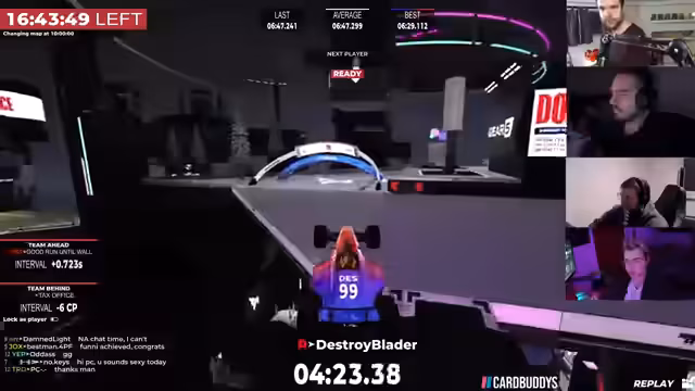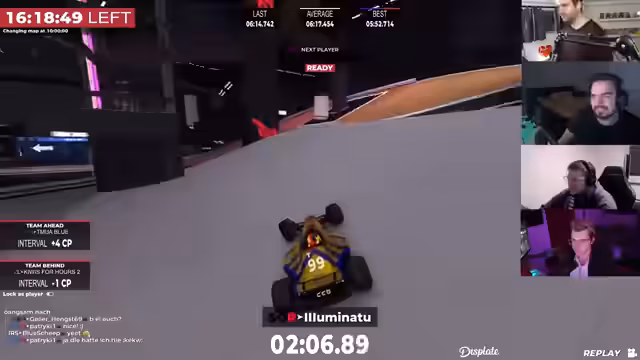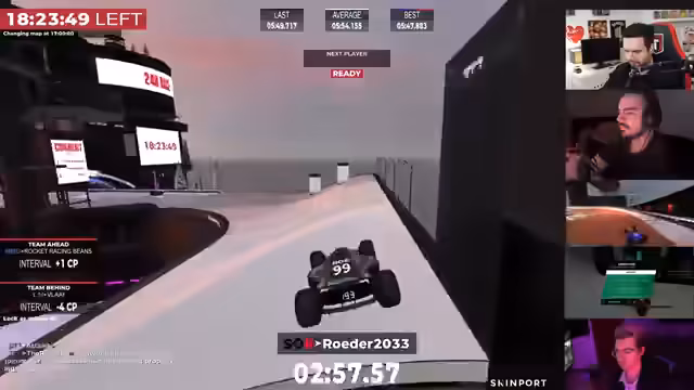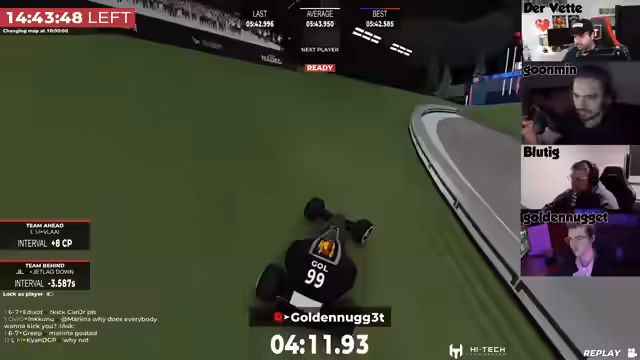05:43:20Im Verlauf des Rennens kommt es zu kontroversen Diskussionen über die Regeln. Insbesondere werden Vorwürfe des illegalen 'Wallbanging' erhoben, bei dem Spieler durch Wände zielen. Die Anschuldigungen werden im Chat mitgeteilt und führen zu einem Hilferuf an die Admins. Die Situation eskaliert so weit, dass gegenseitiges Kicken von Teammitgliedern als taktisches Mittel diskutiert und angewendet wird. Es entsteht eine angespannte Atmosphäre, da die Konsequenzen solcher Aktionen, wie der mögliche Ausschluss aus dem Rennen, ungewiss sind.