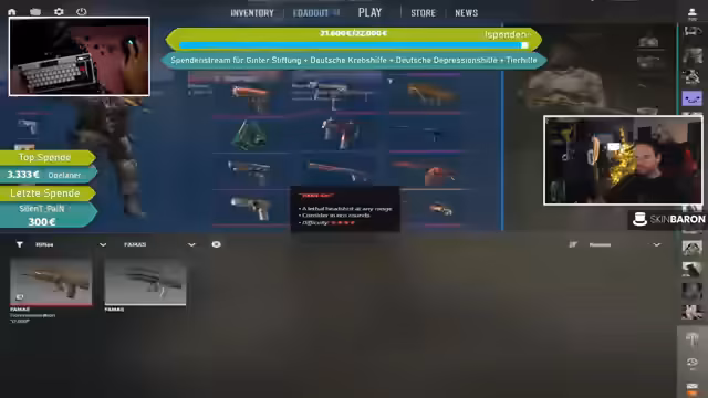 05:12:34Ein hochriskantes CS:GO-Knife-Trade-Up wurde für den Abend angekündigt, bei dem unter anderem ein Butterfly Ruby oder Karambit Emerald möglich sind. Der Streamer erläuterte die potenziellen Gewinne und Verlustoptionen und verwies auf die Partnerschaft mit Skimbaron (Code 'Trillux'). Das vorherige Trade-Up brachte bereits ein Butterfly Vanilla im Wert von 1.500 Euro hervor, was die Erwartungen für das nächste steigert.