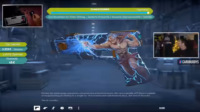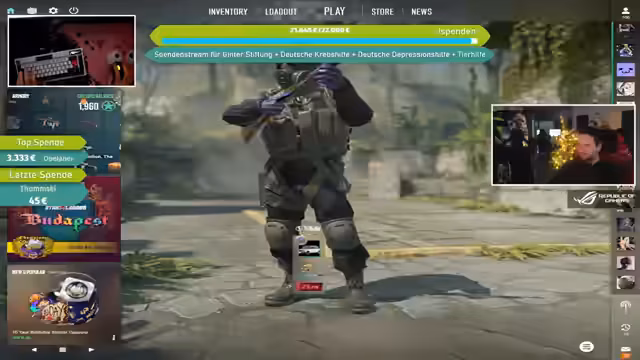 05:20:36Ein Zeus Olympus Skin wurde als Giveaway verlost, wobei der Gewinner 'Stormstrike' zusätzlich mehrere weitere Skins erhielt. Anschließend wurde der Stream für eine gemeinsame Burger-Pause unterbrochen, die für den Vlog dokumentiert werden soll. Die Community wurde auf Instagram-Updates hingewiesen, bevor der Stream vorübergehend beendet wurde, um später mit CS:GO und dem Knife-Trade-Up fortzufahren.