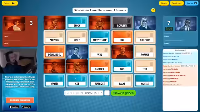05:04:02Im Verlauf des Livestreams werden verschiedene Strategien beim Spielen des Codenames-Teamspiels besprochen. Dabei wird versucht, durch das Ausloten von Wörtern und Begriffen zu raten. Die Spieler agieren kooperativ, um gegnerische Wörter zu identifizieren. Die Herausforderung besteht darin, Synergien zwischen den Wörtern herzustellen, was oft zu humorvollen und unkonventionellen Denkwegen führt. Die Kommunikation ist geprägt von der Analyse von Hinweisen und der gemeinsamen Klärung von Bedeutungen, wobei auch kreative Wortverknüpfungen vorkommen.
