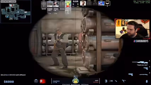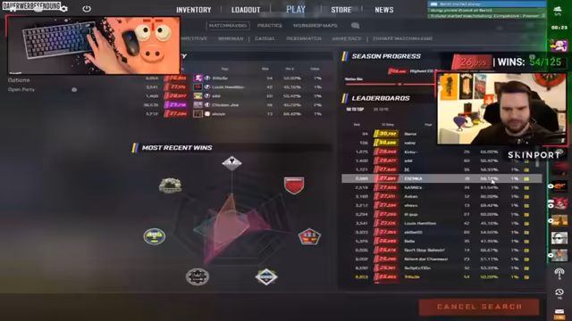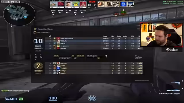 04:21:43Es wird über die Kommunikation mit anderen Spielern über Discord und Teamspeak gesprochen, wobei auf die Bedeutung von Teamspeak für "echte Gamer" hingewiesen wird. Es wird die Idee diskutiert, Alltalk während der Halbzeitpause zu aktivieren, aber Bedenken hinsichtlich möglicher rassistischer Äußerungen werden geäußert. Ein Spieler berichtet, von seinem eigenen Server gekickt worden zu sein. Es gibt Probleme mit dem Steam-Client, der immer wieder ins Hauptmenü zurückkehrt. Es wird überlegt, was die Gegner im Warm-up machen sollen und Prosus wird bestochen, Merle im Team fünfmal zu flashen, im Gegenzug für ein Schweine-im-Arm-Sleeve. Das Spiel stürzt ab und es gibt Probleme mit Twitch, was zu Spekulationen über Arbeitslosigkeit führt. Es wird über die Strategie für die nächste Runde gesprochen, einschließlich der Positionierung und des Einsatzes von Smoke-Granaten.