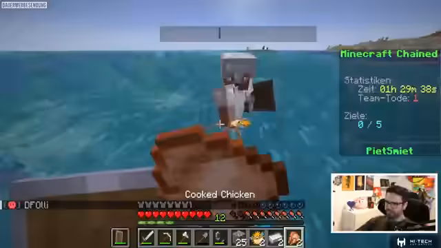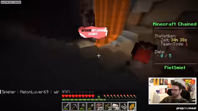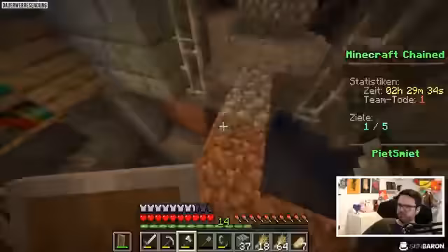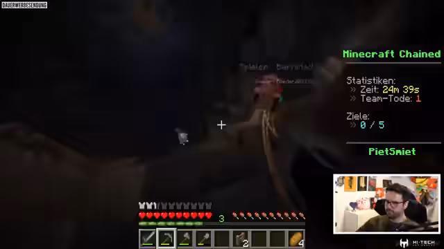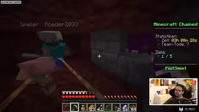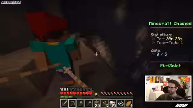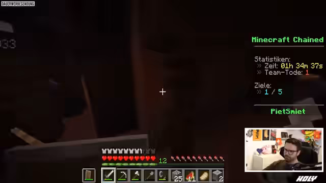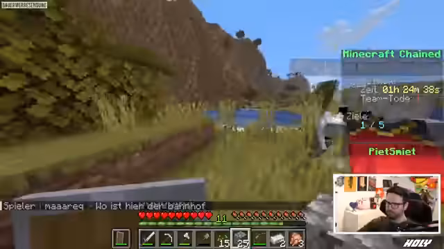 00:11:52Herzlich Willkommen zum heutigen Stream, wo Minecraft zocken und die Pokémon Soul-Link Challenge geplant sind. Das Hauptevent ist Minecraft Chain Together, ein PietSmiet Event, bei dem vier Spieler aneinandergekettet sind und verschiedene Aufgaben bewältigen müssen. Streamer und Teammitglieder Bernie, Armin und Röder sind ebenfalls dabei. Der Server startet um 16 Uhr und geht bis 23:59 Uhr, mit der Einschränkung, dass nur zwei Minecraft-Profis pro Team teilnehmen dürfen und Meta-Wissen verboten ist.