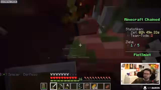 00:15:45Das Spielkonzept von Chain Together kombiniert Minecraft mit dem chained Together Prinzip. Vier Teams müssen fünf Aufgaben in einer eigenen Serverinstanz erledigen, während sie aneinandergekettet sind. Die Aufgaben sind: 1) Besiegen des Enderdrachen, 2) Erreichen von Level 30 für alle Teammitglieder zeitgleich, 3) Absolvieren von 30 Fortschritten (Achievements), 4) Zähmen eines Nautilus-Mobs, und 5) Sammeln einer Wither-Rose. Stirbt ein Teammitglied, kann es nach zwei Minuten respawnen, werden alle Teammitglieder innerhalb von zwei Minuten getötet, wird der Run beendet und das Team an den letzten Respawn-Punkt zurückgesetzt.