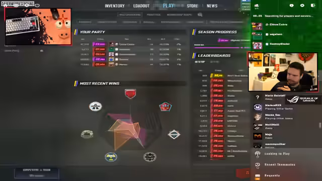 00:10:46Streamer diskutiert seinen Elo-Rang und die aktuelle Season. Er ist mit 24.500 eingestuft und hatte bisher kein Ranglistenverlust. Er äußert seine Sorge bezüglich der saisonalen Entwicklung und der häufigen Panzer-Fähigkeiten, die das System anwendet. Eine mögliche CS Win Challenge für den Samstag wird angekündigt, bei der jede Map einmal gespielt wird.