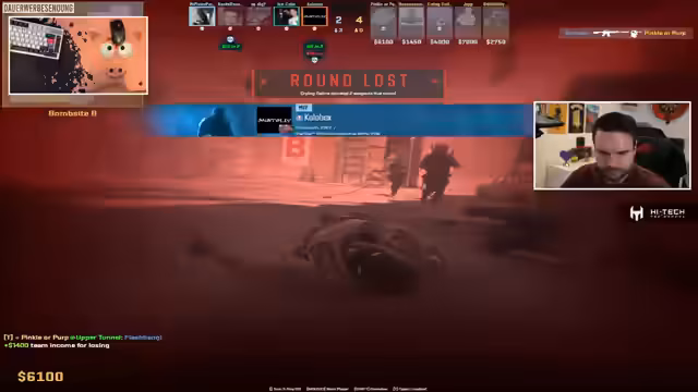 04:02:15Der Streamer äußert seinen Frust über die verlorenen Runden und die vermeintlich schlechten Spielzüge seiner Mitspieler. Er ist besonders verärgert über eine Situation, in der ein Gegner mit einer Scout gegen eine AK reswingt und ihn tötet, obwohl der Gegner bereits drei Hits kassiert hatte. Er bezeichnet dies als 'schlechtes Play' und ist sauer darüber, dass solche Fehler zum Tod führen. Diese Emotionen spiegeln die Intensität des Spiels wider und die hohen Erwartungen an die Performance im Team.