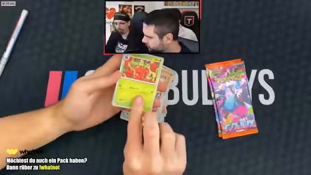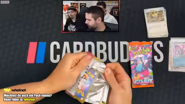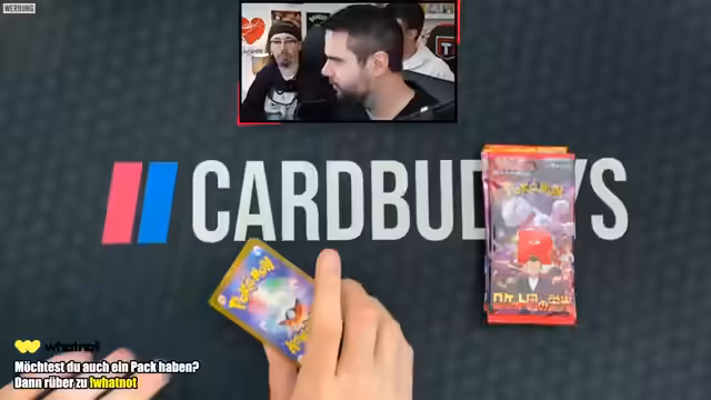 01:00:01Der Stream beginnt mit der Eröffnung mehrerer Sechser-Bundles, bei denen Gewinner die darin enthaltenen Karten erhalten. Der Streamer bewirbt das Angebot von Whatnot, bei dem Neukunden 15 Euro Startguthaben erhalten, um Booster-Packs zu erwerben. Zuschauer wie Aridia, Vat Volt und Jasmin nutzen diese Möglichkeit und sichern sich mehrere Booster. Der Fokus liegt auf der Verlosung der Karten, während der Streamer zur Teilnahme und zum Bieten ermutigt und besonders auf die Möglichkeit eingeht, seltene Karten wie das Glurak Gold zu ziehen.