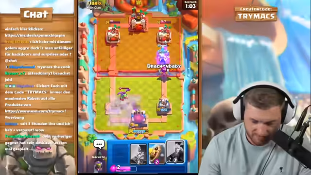 01:38:29Es wird direkt in die Grand Challenge eingestiegen, mit dem Ziel, zwölf Siege zu erreichen, wofür 50 Subgifts versprochen werden. Der Koch ist nicht im Deck, was als Handicap angesehen wird. Gegen einen Prinzen soll die Maschine vor dem Ofen platziert werden, um zu tanken. Der Baby Dragon wird ganz hinten gespielt, gefolgt vom Mini-Pekka. Vines und Barbrill werden zur Unterstützung eingesetzt. Es wird erklärt, dass der Golem an der Brücke platziert werden soll, um den Gegner zu zwingen, seinen Elektro-Jaggen einzusetzen. Nach einem Sieg wird das nächste Spiel analysiert, wobei der Fokus auf dem Einsatz des Ofens und Bubbles liegt. Ein weiteres Spiel wird gewonnen, indem der Gegner abgefressen wird. Es wird festgestellt, dass das Deck "broken" ist und man sich wundern muss, wenn man dagegen verliert. Trotzdem wird betont, dass das Deck noch gelernt werden muss und Fragen gestellt werden sollen, um die Spielweise besser zu verstehen. Der Evo Baby Dragon wird als wichtiger als der passive Druck des Ofens hervorgehoben, da er in der einfachen Elixierphase einen Golem-Push ermöglicht.