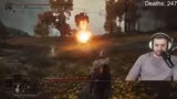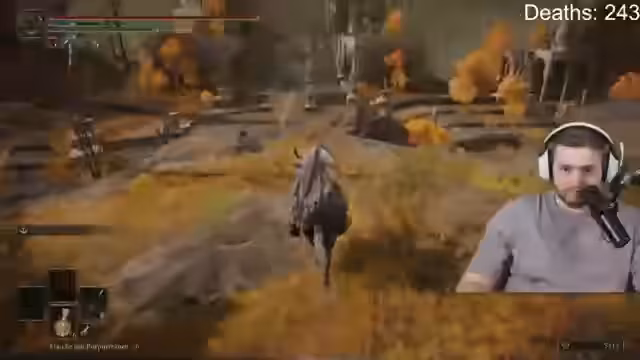 03:29:46Am Fuße des Baums trifft der Streamer auf den Bosskönig Radahn. Nachdem er die Animationen bei der Begegnung beobachtet hat, beginnt der Kampf. Radahn reitet auf einem Drachenpferd, das Feuer speit, während Radahn selbst Blitzangriffe vom Himmel herablässt. Der Kampf gestaltet sich als äußerst herausfordernd und langwierig, da der Streamer die Angriffsmuster nur schwer erkennen kann.