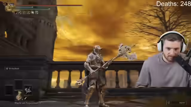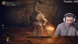04:15:08Nach der Konfrontation mit Radahn begibt sich der Streamer in die Burg Erdtree-Castle. Das riesige Gebäude verwirrt ihn, und er verliert zeitweise den Orientierungssinn. Während der Erkundung kämpft er gegen starke Gegner und findet neue Gegenstände, wie Schmiedesteine. Das Aussehen des Ortes und der Architektur beeindruckt ihn.