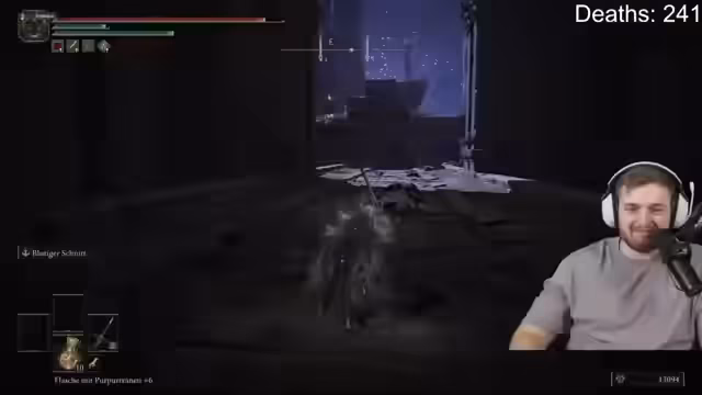 00:15:31Gegen Ende des Streams gelingt dem Streamer ein nahezu perfekter Versuch. Er bleibt sehr am Ball, nutzt das Pferd von Radahn effektiv, um sich zu bewegen und Angriffe zu vermeiden, und verhindert, dass der Boss bestimmte Fähigkeiten einsetzt. Nachdem er Radahn auf sehr niedrige Lebenspunkte gebracht hat, nutzt er einen Heiltrank, um den letzten Angriff zu überleben und besiegt ihn. Dies geschieht, ohne dass er die Elektrowelle jemals erfolgreich ausweichen musste, was den Sieg auf reines Glück und Timing zurückführt.
