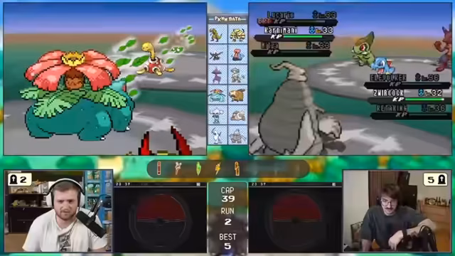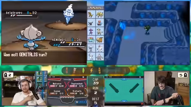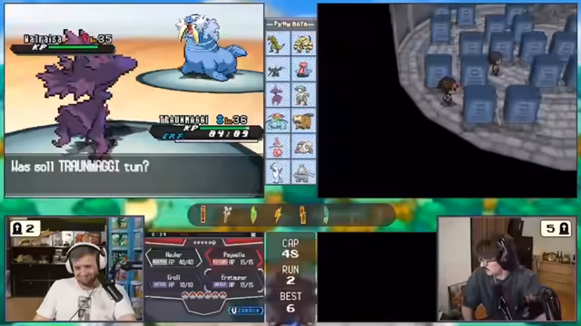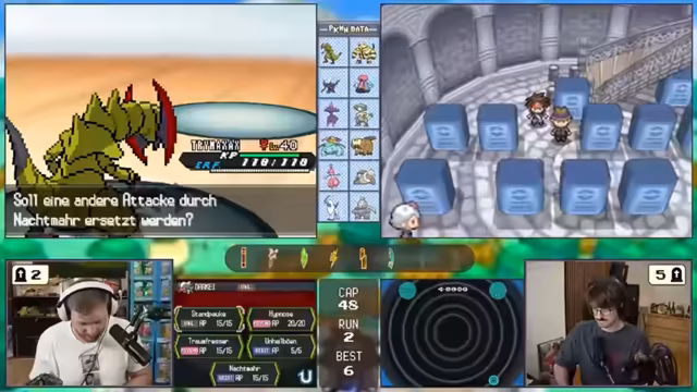 04:12:31Ein Kampf in der Arena erweist sich als sehr schwierig, was den Streamer dazu veranlasst, Hypertränke oder Kuhmummig zu verwenden. Es kommt zu einem turbulenten Kampf, in dem ein gegnerisches Pokémon auf Level 37 den Streamer in Schwierigkeiten bringt. Später wird eine Kampf-Psycho-Arena bekämpft, in der der Gegner mit der Attacke 'Angeberei' den Angriff des Streamers stark boostet, was zu einem Gamble führt, der letztendlich erfolgreich verläuft.