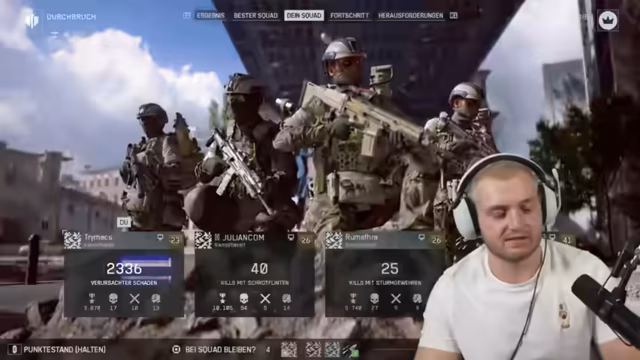 02:47:45Der Streamer wechselt vom Farmen in den normalen Multiplayer und versucht, mit seinen Teamkollegen Julian und Romatra eine Runde zu spielen. Die Kommunikation und das Zusammenspiel stehen hier im Vordergrund. Sie testen verschiedene Rollen, wie den Versorger und den Spawn-Beacon-Platzierer, um strategische Vorteile zu erlangen. Obwohl die Map und das Teamplay anfangs holprig sind, finden sie letztendlich einen Weg, durch gekonntes Flanken und Positionieren das Spiel zu gewinnen.