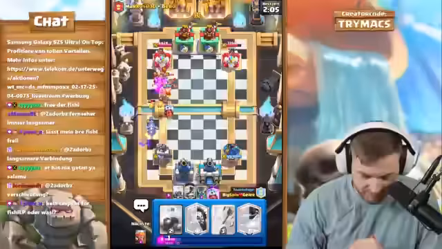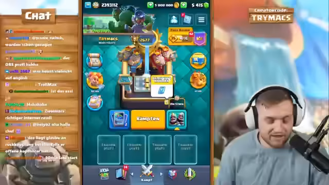 00:00:50Der Stream beginnt mit dem Begrüßung der Zuschauer und der Ankündigung eines 2-vs-2-Duells mit Bixby in Clash Royale. Hauptziel des Streamings ist es, in der aktuellen Season in die Top 1000 der globalen Rangliste vorzustoßen. Nach dem Ranglistenpush ist ein neues Spiel, Brawl Stars, geplant. Im Chat werden technische Probleme bei der Verbindung des Streaming-PCs erwähnt, die aber behoben werden können. Anschließend startet ein Gewinnsspiel für fünf Zuschauer, die eine Probierbox mit Snacks von Aoste gewinnen können. Die Teilnahme erfolgt über den Befehl !a-oste-paket.