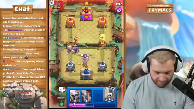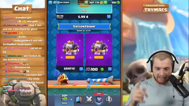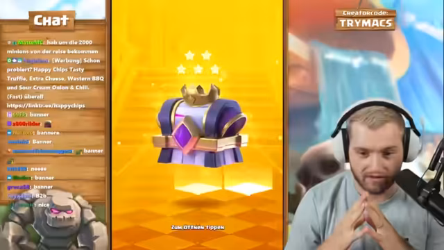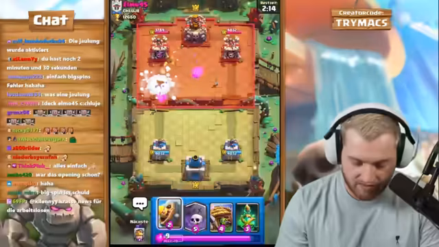 00:08:17Der Streamer startet das lang erwartete Clash Royale Opening, bei dem er die Belohnungen aus drei Events – dem Seasonal Event, den CL World Finals und der Clan-Reise – öffnet. Er hat das gesamte Event während seiner Podcast-Tour nachts im Hotel durchgespielt. Ziel ist es, bis 13.400 Trophäen zu pushen und eine weitere Kiste zu öffnen. Während des Openings zieht er off-stream bereits einen 5-Star und ein Universalbuch, was ihn jedoch nicht vollständig begeistert, da er Elite-Joker für spezifische Karten wie den Ritter, die Berserkerin, die Hütte, den Friedhof und den Golem benötigt. Die Öffnung der Seasonal Chests führt zu einer großen Enttäuschung, als er seinen ersten On-Stream 5-Star zieht, der sich als unansehnlicher Kampfbanner herausstellt, was zu Frustration führt, da er sich mehr erhofft hatte.