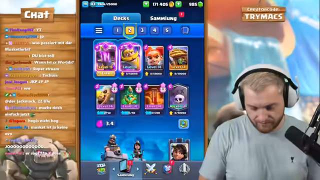 00:19:23Der Streamer steht vor der Herausforderung, ein geeignetes Deck für das Pushen auf 13.400 Trophäen zu finden. Er hat drei Kartenboosts zur Verfügung und überlegt, welches Deck er spielen soll, da sein bevorzugtes Walküren-Deck ohne Evo-Ritter nicht optimal ist und er keine weiteren Boosts hat. Er entscheidet sich, ein Universalbuch für den Friedhof einzusetzen, da er sich als Friedhofspieler sieht und seinen Wurzeln treu bleiben möchte, auch wenn das Deck derzeit nicht meta ist. Nach dem Upgrade des Friedhofs auf Level 14 und dem Einsatz der Kartenboosts startet er in die ersten Matches. Trotz eines nicht-meta Decks und einiger Schwierigkeiten, wie dem Überleben von Musketieren mit 1 HP, gelingt ihm ein erster Sieg. Die Zeitwahrnehmung während des Spiels erweist sich als Problem, was zu einem verlorenen Spiel führt und die Notwendigkeit einer besseren Kommunikation mit seinem Coach Big Spin verdeutlicht.