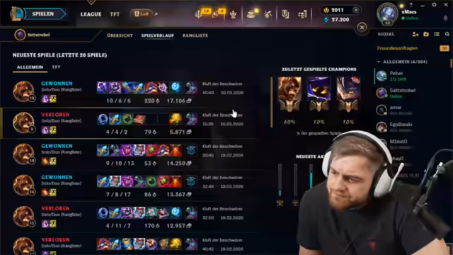03:25:26Nach dem Abschuss der Finanzthemen wechselt trymacs zu League of Legends. Er beklagt seinen Rangverlust in Silber 4 und plant, nach einem Jahr ohne Solo-Queue ein Spiel zu wagen. Sein Ziel ist der Aufstieg zu Gold. Das erste Match gestaltet sich jedoch katastrophal, da er gegen einen übermächtigen Talon-Smurf und einem unterlegenen Team verliert und das Matchmaking kritisiert.