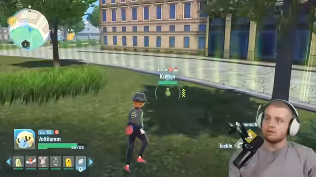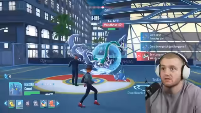 00:23:28Nach dem ersten Kampf wird der Streamer in die Kampfsektoren eingeführt, ringförmig aufgebaute Bereiche, in denen man auf Trainer trifft und Kämpfe bestreiten kann. Er muss aus einem Kampfsektor entkommen, was ihn an Spiele wie 'The Purge' erinnert, da jeder ihn angreifen kann. Er trifft auf eine Serviererin, die ihn herausfordert, und gewinnt den Kampf mit seinem Endivie. Das Kampfsystem gefällt ihm weiterhin, obwohl er die fehlende Synchronisation und die generische Charakteranpassung bemängelt. Später gelangt er in ein Pokémon Center, wo er seine Pokémon heilen und Items kaufen kann. Er fängt seine ersten wilden Pokémon, darunter Dateri und Scoppel, und sammelt Pokébälle. Er bemerkt, dass das Fangen von Pokémon sehr einfach ist und die Wildsektoren eine gute Möglichkeit zum Leveln bieten, auch wenn die Story-Einführung der Sektoren etwas erzwungen wirkt.