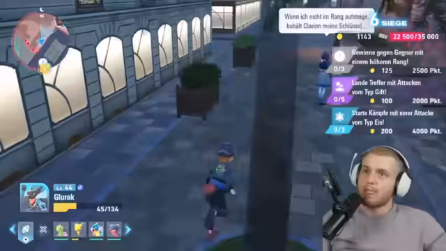 01:27:34Der Streamer kämpft mit seinem letzten Pokémon, einem Voltilam Level 8, gegen ein Pikachu. Nach einem spannenden Kampf, in dem er Donnerwelle und Tackle einsetzt, besiegt er das Pikachu. Sein Pokémon, ein Hase, steigt auf Level 11 auf. Trotz des Sieges bemerkt er, dass dies das hundertste Mal ist, dass er jemand anderen im Rang aufsteigen sieht. Er selbst hat seine 100. Niederlage in einem Aufstiegsmatch erlitten, wird aber dennoch zum Rang Y befördert. Er erhält 1300 Pokedollar und besiegt drei Trainer, was ihm ein Preisgeld von 8000 Pokedollar im Early Game einbringt. Die Spielmechanik, die Attacken und Positionierung der Pokémon hervorhebt, wird vom Streamer als beeindruckend, aber noch nicht vollständig verstanden, kommentiert.