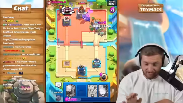 00:11:17Mit dem Ziel, schnell Trophäen zu sammeln, setzt der Streamer auf ein Golems-Deck. Dieses Deck teuer in der Elixir-Nutzung und rotiert langsam, hat aber in der Doppel-Elixir-Phase eine hohe Durchschlagskraft. Er spielt gegen Gegner mit teilweise deutlich höheren Kartenleveln, gewinnt aber dank strategischen Fehlern der Gegner und cleverem Placements seiner Einheiten wie der Geisterkaiserin und dem Elektro-Drachen. Er baut eine ansehnliche Siegesserie auf und sammelt dabei wertvolle Erfahrungspunkte und Gold.