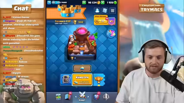 00:01:17Das Hauptziel für den Stream ist das Erreichen von 5500 Trophäen in Clash Royale. Dieser Wert ist entscheidend, um den Pass öffnen zu können. Je höher die Arena, desto besser sind die Belohnungen aus den Lucky Drops, bis zu achtfach bessere Karten. Der Streamer befindet sich aktuell bei 4500 Trophäen und muss also 1000 Trophäen in verbleibender Zeit schaffen. Der Account ist frisch, sodass viele Karten ein niedriges Level haben, was den Wettbewerb erschwert.