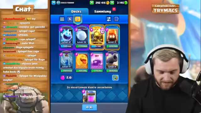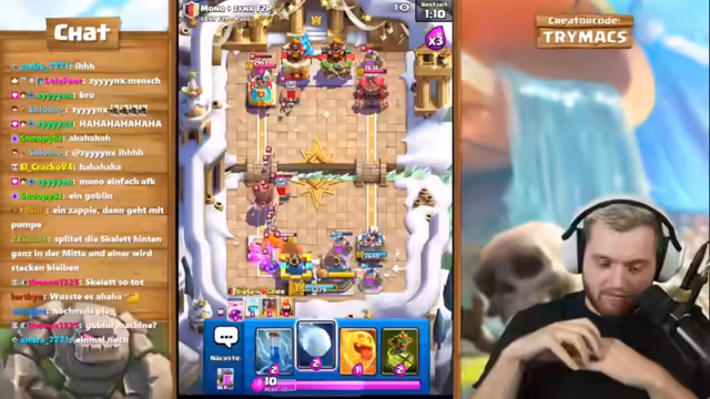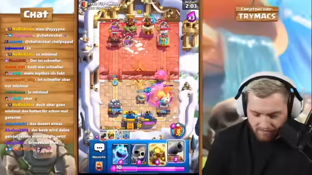 02:58:03Nach mehreren Anläufen gelingt es dem Streamer, mit den drei Musketieren einen Gegner in nur 20 Sekunden zu besiegen. Er beschreibt den Sieg als brutal und asozial, was er als besonderes Happening betrachtet. Anschließend konzentriert er sich auf das nächste Ziel: die Freischaltung des Helden Mini Pekka für den Pass. Er erreicht die 5000 Trophäen-Marke mit seinem Level-1-Account, stellt jedoch fest, dass der Helden-Mini Pekka im Pass Royal noch nicht verfügbar ist. Dies verursacht Verwirrung, da er angenommen hatte, dass der Held ab 5000 Trophäen freigeschaltet werden sollte.
