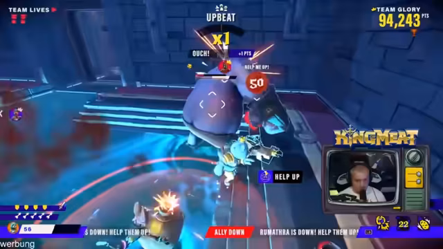 01:03:28Die Unterhaltung ist voller humorvoller Missverständnisse und kleiner Auseinandersetzungen. Rumathra wirft Big Spin vor, zu geizig zu sein, während ein Streit um die Verteilung von Athlete-Stack-Kapseln den Ton vorgibt. Gleichzeitig äußert sich Rumathra frustriert über seinen Cam-Freeze, was im Chat zu Glauben führt, er habe den Techniker angezickt. Das Gameplay zeigt auch die Teamdynamik, da sich die Spieler gegenseitig heilen und Probleme wie den 'Bodyblock' bei gemeinsamen Aktionen ansprechen.