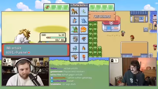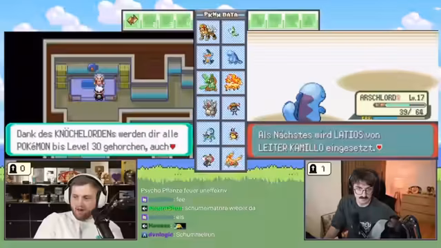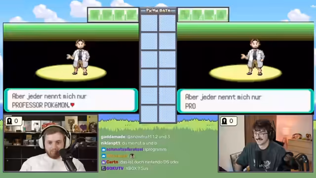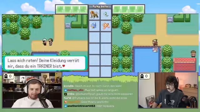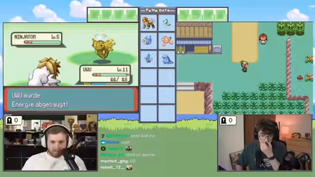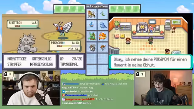 00:54:36Der Streamer beginnt in der Heimatstadt, besucht das Pokémon-Center, um seine Pokémon zu heilen, und erhält vom Professor den Auftrag, die Welt zu erkunden. Nach der Rückkehr zum Labor und der Ausrüstung mit Pokébällen beginnt die eigentliche Challenge. Beide Spieler verlassen das Labor, um auf Route 101 das erste selbstgefangene Pokémon zu suchen, wobei der Fokus auf dem Fang eines Pokémon liegt und alle anderen Aktionen wie Heilen oder Plündern zweitrangig sind. Das Ziel ist, das gesamte Spiel mit der Beschränkung, dass jedes Pokémon nur im Level 5 gefangen werden darf, durchzuspielen. Ein Pokémon stirbt versehentlich, was die Herausforderung erschwert.