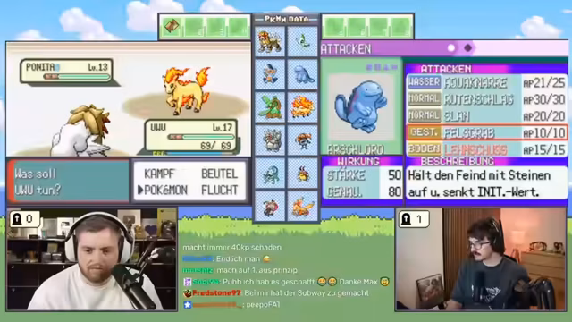 01:11:43Bei der Erkundung der Route stößt der Streamer auf einen Angler-Trainer, der ein extrem starkes und zufälliges Pokémon in seinem Team hat: Deoxys. Dieser Kampf stellt eine massive, unvorhergesehene Hürde dar, die die gesamte Challenge bedroht. Durch geschicktes Tauschen und gezielte Attacken, wie Lehmenschelle, gelingt es, das Deoxys zu schwächen. Nach einem langen und nervenaufreibenden Kampf, in dem das Wickel-Status-Debuff und ein kritischer Treffer eine entscheidende Rolle spielen, gelingt es, das Deoxys zu besiegen. Dies ist ein Sieg, der das gesamte Team rettet und den Fortbestand der Challenge sichert.