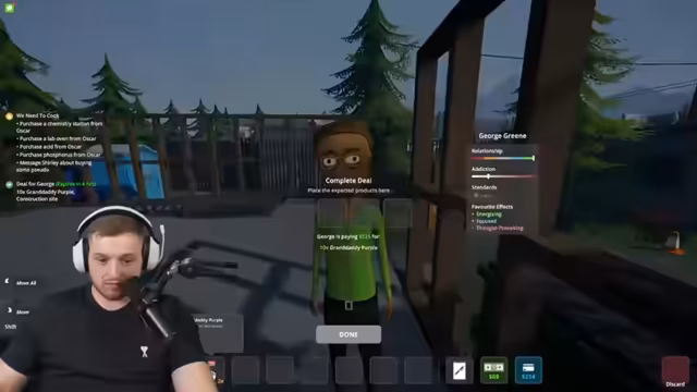 02:07:51Das Stream-Ergebnis wird zur Bank gebracht, um neue Ausrüstung zu kaufen. Es wird ein Mischpult erworben, um die Effektivität der Produktion zu erhöhen. Ein benannter Dealer, Benji, eingestellt, der automatisch Dosen verkauft und somit ein passives Einkommen generiert. Gleichzeitig werden neue, teurere Drogensorten gemischt, um die Süchtig machenden Effekte zu verstärken und den Profit zu maximieren.