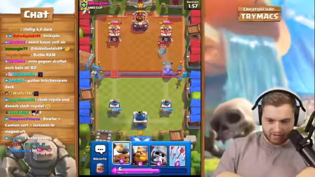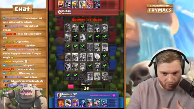 00:00:10Zu Streambeginn werden im Chat Meldungen über den Tod eines Spielers namens Chef Strobl in World of Warcraft geteilt, was zu Verwirrung führt. Der Streamer weist darauf hin, dass es sich um einen Bug handeln könnte. Nachdem technische Aspekte wie der Übertragungsstatus geklärt sind, wird der Fokus auf den bevorstehenden Clash Royale-Part mit BigSpin gelegt. Ein Ziel wird festgelegt: Bei 15 ungeschlagenen Siegen im Mega-Draft-Modus erhalten 50 Sub-Gifts. Zudem wird ein neues Event mit einer Ice-Inferno-Truhe erwähnt und die große Viewerbase unter dem Credit Code 'Trimax' bedankt.