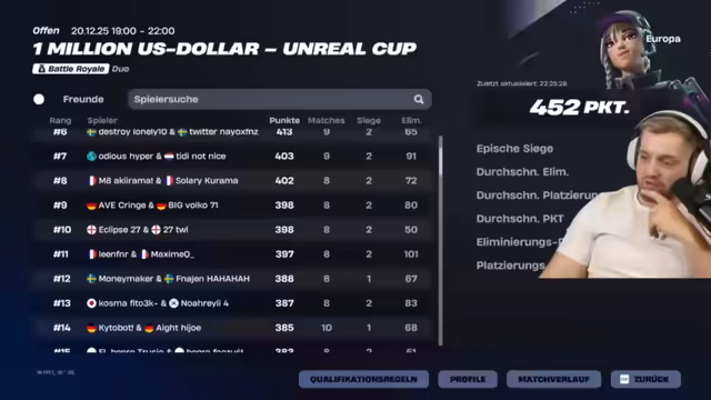 00:06:52Der Streamer bereitet sich intensiv auf den 1 Million US-Dollar Unreal Duo Cup vor. Sein Hauptziel ist es, mit seinem Partner Julian Kohn offiziell als E-Sportler anerkannt zu werden. Dies ist die bisher beste Chance, da es um offizielle Earnings geht, die nicht aus Creator Cups stammen. Sie müssen in die Top 2000 kommen, um das Preisgeld von 100 Dollar (geteilt) zu erhalten und damit einen Meilenstein in seiner Karriere zu erreichen.