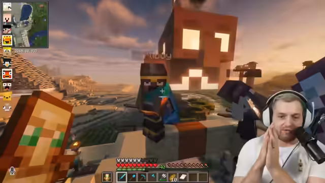 02:18:14Die Gruppe bewundert die entstehenden Drachen und Baron Nashors auf der Karte. Sie fliegen zum roten Nexus, wo der Streamer Max beobachtet, wie dieser seine Elytra mit XP-Flaschen repariert. Der Streamer erwähnt die Gefahr der TNT-Duper von Chef Strubel, die er selbst abgebaut hat, da sie die Map gefährden würden. Die Gruppe wirft sich gegenseitigXP-Flaschen zu und fliegt weiter, um die Yu-Gi-Oh!-Karte und das Matterhorn zu besichtigen, das von Adi Toronto gebaut wird.