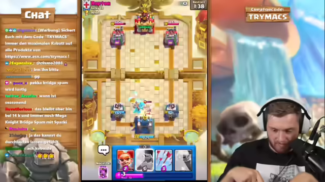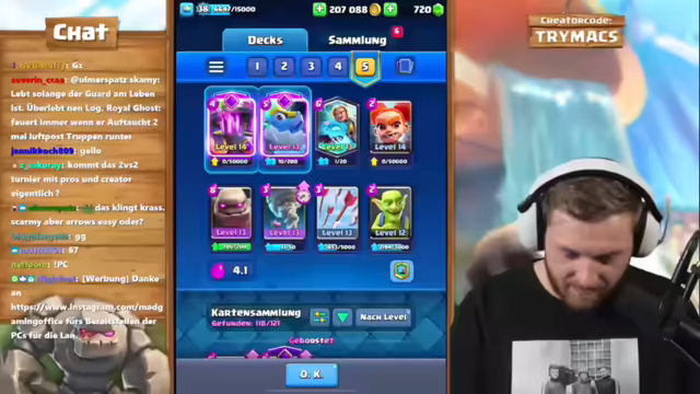 02:38:07Der Streamer präsentiert sein Deck mit Golem 14, Berserkerin 14 und Ofen 14. Er erwähnt bevorstehende Balance-Änderungen und Merge Tactics. Er will ohne Coach 9.5 erreichen, was schwierig werden könnte, da er oft gegen Pekka Evo 15 und Mega Ritter Evo 15 spielt. Manchmal trifft er auf Decks mit vielen Golem-Kontern wie Pekka 15, Mini-Pekka und Inferno-Turm. Er versucht, mit seinem Deck in die Doppelte-Elixier-Phase zu kommen, obwohl er oft gegen Gegner mit zwei Leveln höheren Karten spielt. Er verliert ein Spiel aufgrund eines Fehlers und eines leeren Headsets, gewinnt dann aber drei Spiele in Folge. Er erklärt, dass der Nado wichtig ist, wenn man Free2Play spielt oder unterlevelt ist, da er seinen Job immer macht. Er hat eher Türme auf Level 14 und manchmal sogar auf Level 15, aber durch den aktivierten King Tower hat er zusätzliche Feuerkraft. Er erwähnt, dass er den Royal Ghost Evo für OP hält und freut sich über 200 Gems durch Masteries und im Pfad. Er fordert Koboldhütten an, da es noch lange dauern wird, bis er diese auf Level 13 hat. Er braucht nur die 10.000 Trophäen.